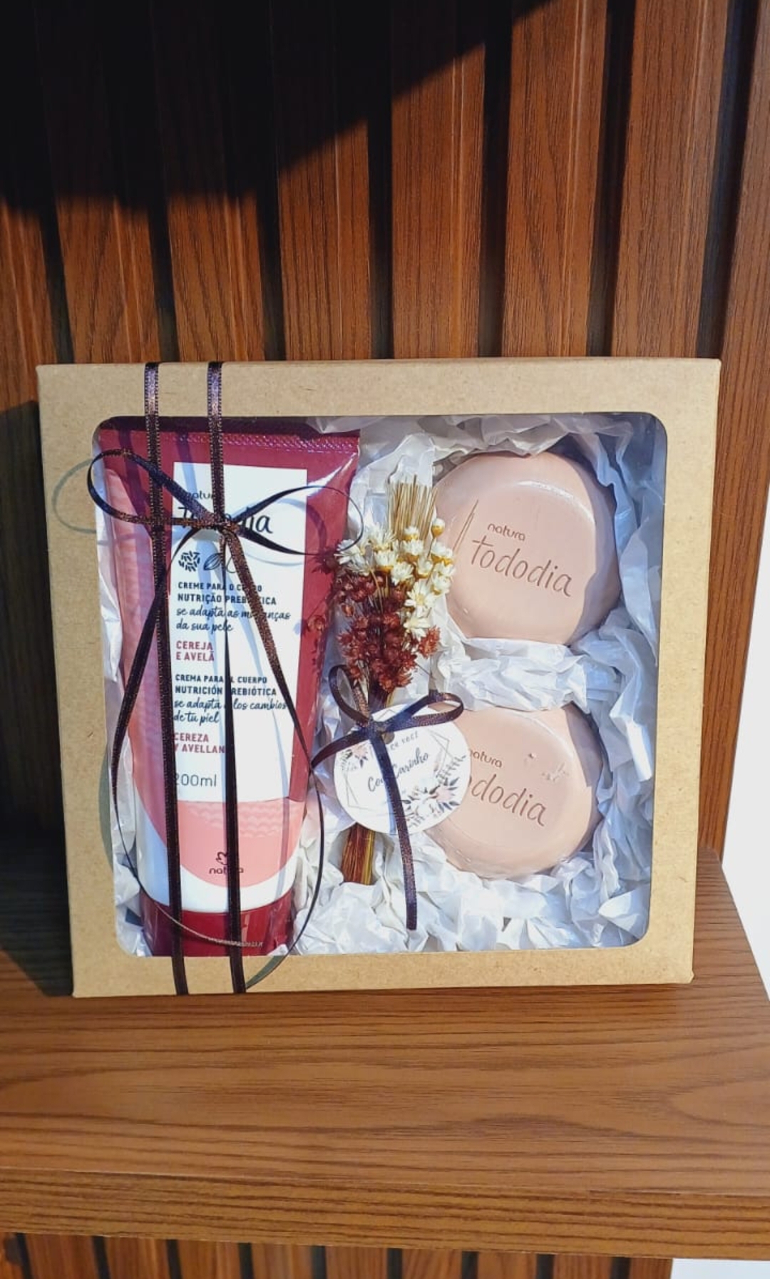 O presente contém 1 Hidratante Corporal Cereja e Avelã 100Ml, Sabonetes em Barra Natura Tododia 90Gr Embalagem Completa + Sacola + Amostrinha sortida